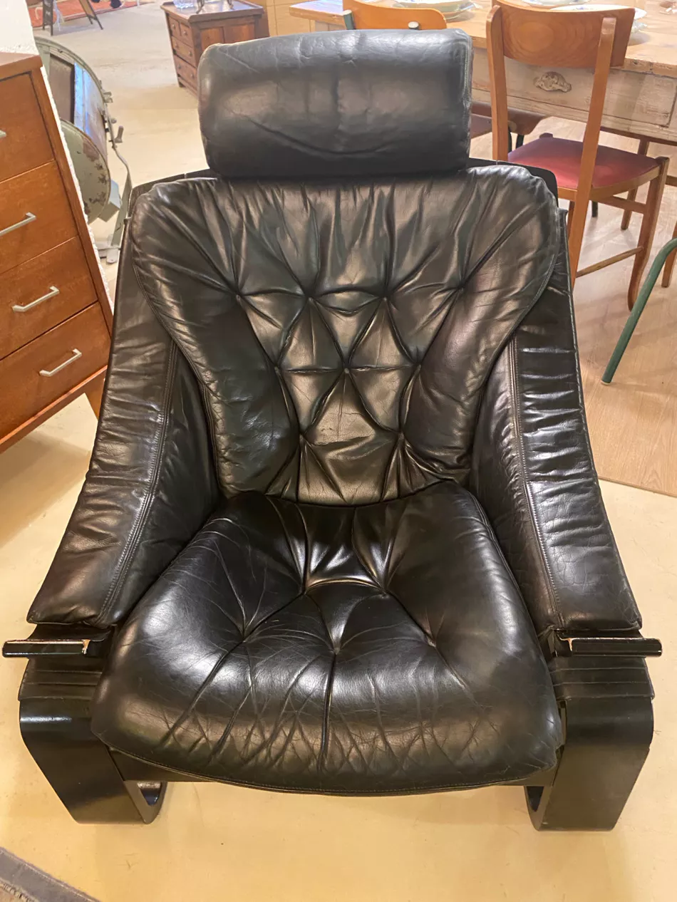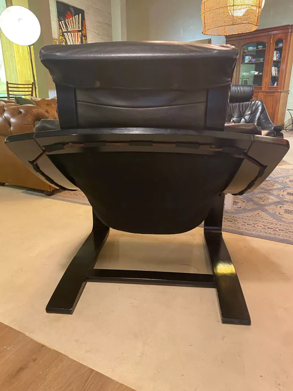 Superbe fauteuil KROKEN par Ake FRYBYTTER pour NELO, 1970 Suède. En très bel état, ce fauteuil est composé d’une structure de bois courbé laqué noir muni d’un revêtement cuir sans aucun accroc ni frottement.
