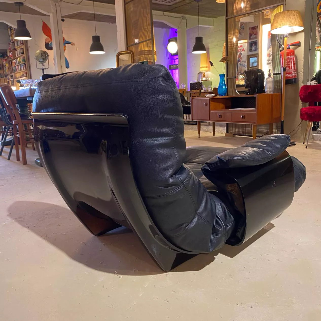 Superbe fauteuil MARSALA ligne rosèrent en très bel etat! Coque et supports accoudoirs en plexi glas, assise et accoudoir en cuir sans aucun accroc ni déchirure. A noter un petit frottement sur l’un des deux support plexi glas / dernière photo.