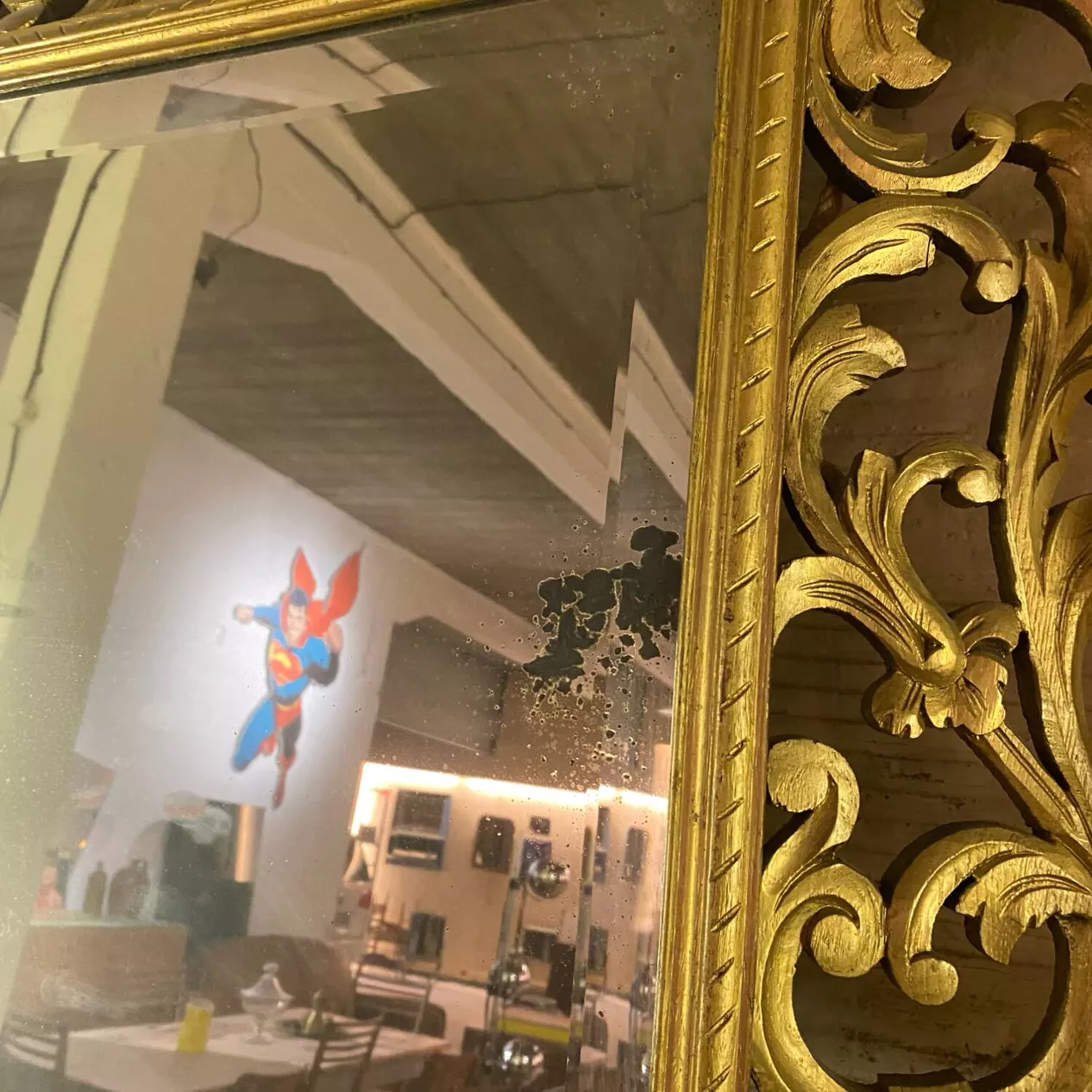 Superbe miroir ancien en bois sculpté, le carreau est biseauté est légèrement taché, je pense du à son origine à base de mercure.